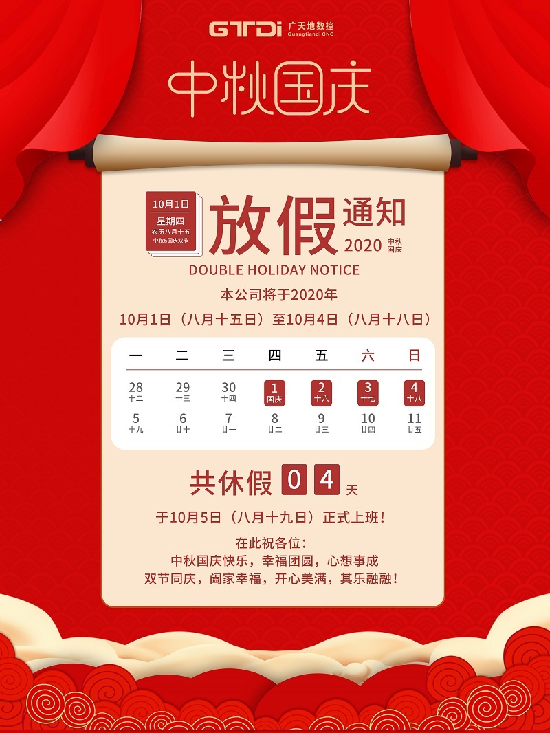 当前位置: 资讯 > 企业新闻 > 亚星|会员数控2020年国庆中秋节放假通知 < 返回列表