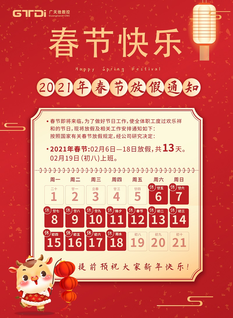 2021年春节将至,首先感谢您在2020年里的鼎力支持和愉快合作,亚星|会员数控全体同仁在此给您拜个早年。在新年的一年里,亚星|会员将更加努力,为您提供更优质的服务。按照国家春节放假规定结合我司的具体情况,春节放假时间安排如下: